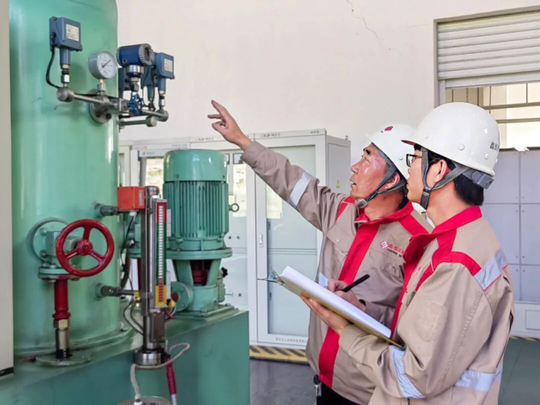 刘录山、胡佳诚以“国庆我在岗,电站运行有我做保障”的担当,坚守在生产一线。白色安全帽下,是他们专注的眼眸;工装制服上,是责任的重量。他们一人手指设备细致研判,一人手持台账认真记录,每一次对仪表的核查、每一处对机组的巡检,都为电力稳定供应筑起的铜墙铁壁。